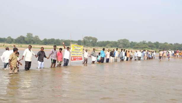 எனவே தமிழக அரசு திருமணி-மேல்மொணவூர் இடையே பாலாற்றில் தரைப்பாலம் அமைக்க கோரி இன்று பாலாறு பாதுகாப்பு இயக்கத்தின் சார்பில் மார்தாண்டம் தலைமையில் பாலாற்றில் இடுப்பளவு தண்ணீரில் இறங்கி கிராம மக்கள் மனித சங்கிலி போராட்டத்தில் ஈடுபட்டனர்.