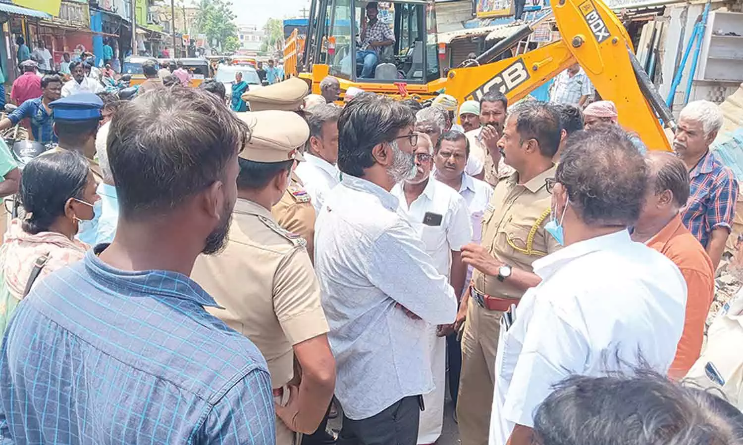 இதுபற்றி அறிந்ததும் ஏராளமான வியாபாரிகள் குவிந்து அதிகாரிகளிடம் வாக்குவாதம் செய்தனர். மேலும் ஆக்கிரமிப்புகளை அகற்ற 2 நாட்கள் அவகாசம் கேட்டனர். இதனால் ஆக்கிரமிப்பு கடைகளை அகற்றும் பணி பாதியில் நிறுத்தப்பட்டது.