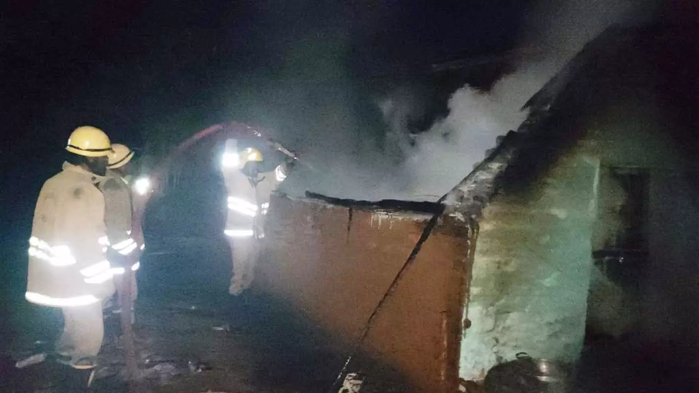 குடிசை வீட்டில் பற்றி எரிந்த தீயை தீயணைப்பு வீரர்கள் தண்ணீரை பீய்ச்சி அணைத்த காட்சி.