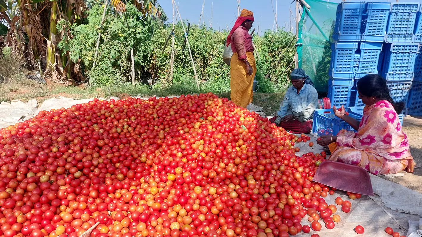 மார்க்கெட்டுக்கு கொண்டு செல்ல விவசாயிகள் தக்காளியை பெட்டிகளில் அடுக்கும் போது எடுத்த படம்.