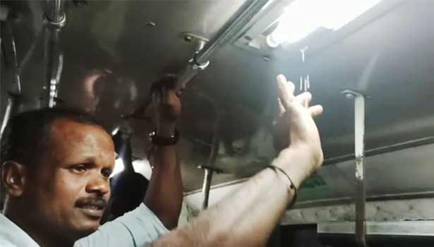 பஸ்சுக்குள் குடைபிடித்து பயணித்த பொதுமக்கள்