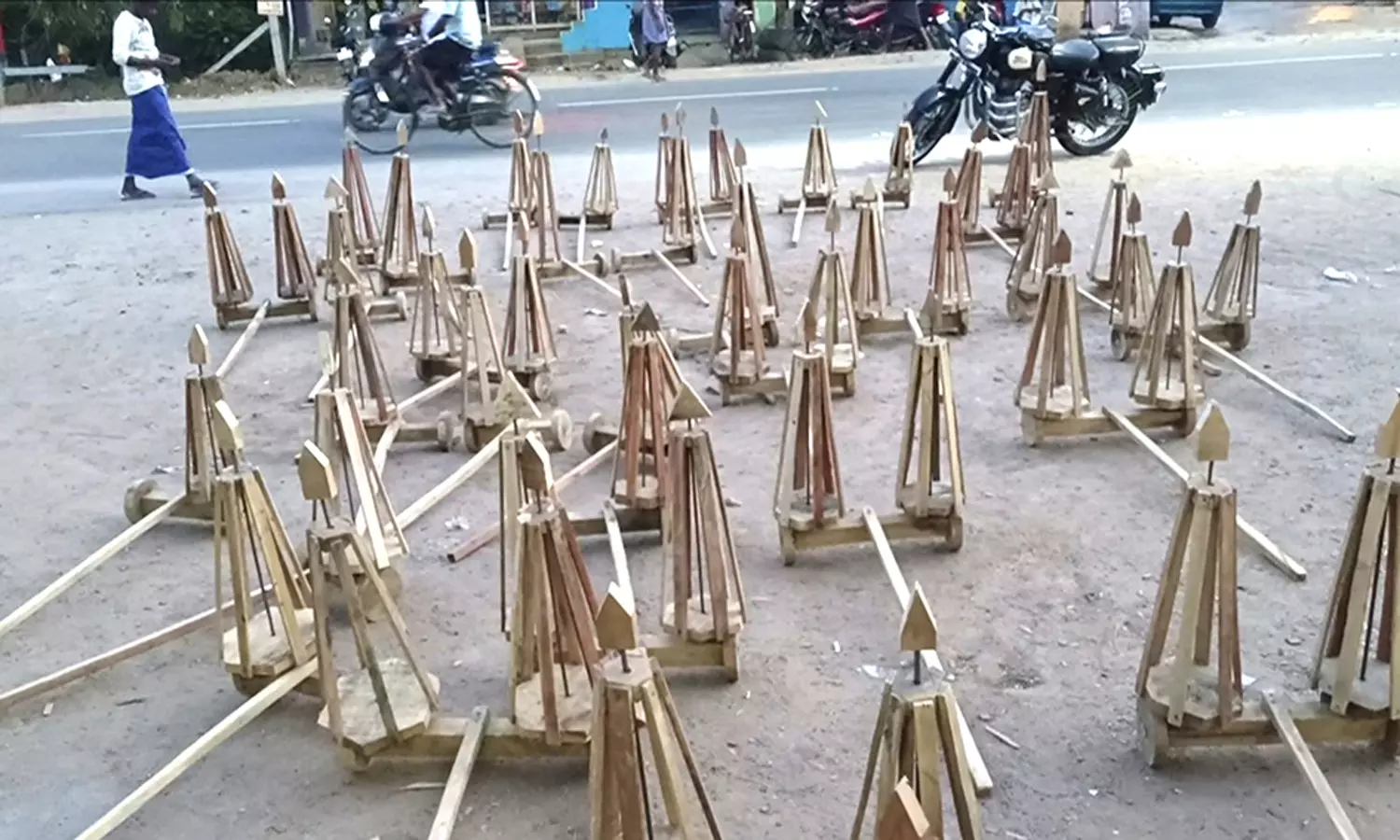 தச்சுத்தொழிலாளர்கள் விதவிதமான சிறு தேர்களை தயார் செய்து விற்பனைக்கு கொண்டு வந்துள்ள காட்சி.