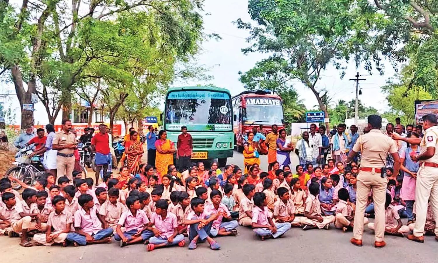 இதனால் ஆத்திரம் அடைந்த பள்ளி மாணவ-மாணவிகள் இன்று காலை தங்களது பெற்றோர்களுடன் புறப்பட்டு பள்ளிக்கு சென்றனர். பின்னர் சிறிது நேரத்தில் மன்னார்புரம் ஊருக்கு அருகே அம்பை-தென் காசி சாலையில் திடீரென அவர்கள் அமர்ந்து மறியல் செய்தனர். தகவல் அறிந்து அம்பை துணை போலீஸ் சூப்பிரண்டு சதீஷ் குமார், இன்ஸ் பெக்டர் மகேஷ் குமார் மற்றும் போலீசார் அங்கு விரைந்து சென்று பேச்சு வார்த்தை நடத்தினர்.