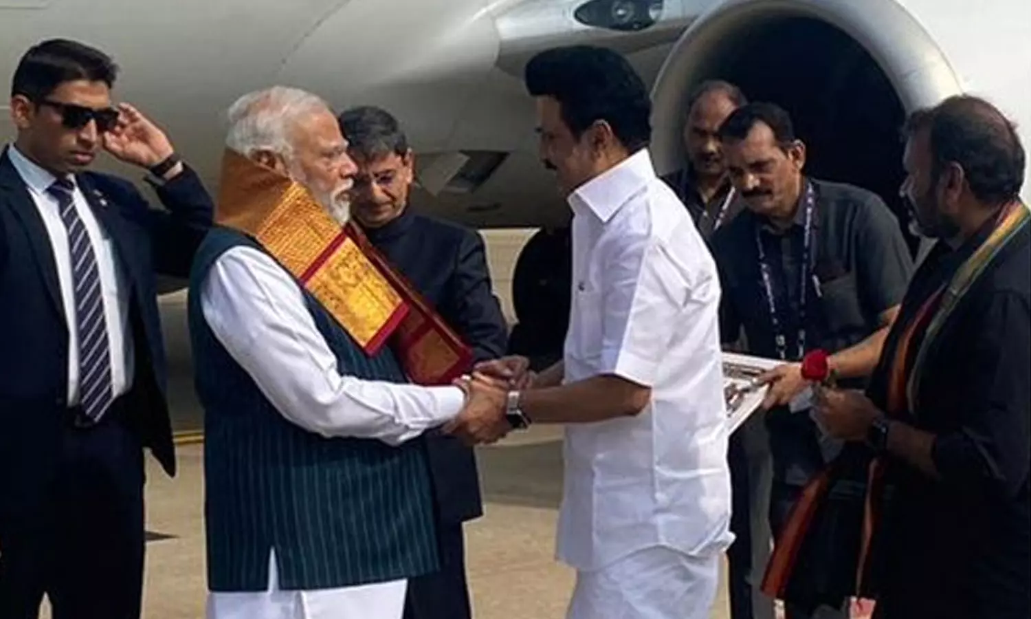 இதற்காக தனி விமானம் மூலம் இன்று காலை 10.10 மணிக்கு திருச்சி விமான நிலையத்திற்கு பிரதமர் மோடி வந்தார். அவரை கவர்னர் ஆர்.என்.ரவி, முதலமைச்சர் மு.க.ஸ்டாலின் உள்ளிட்டோர் வரவேற்றனர்.