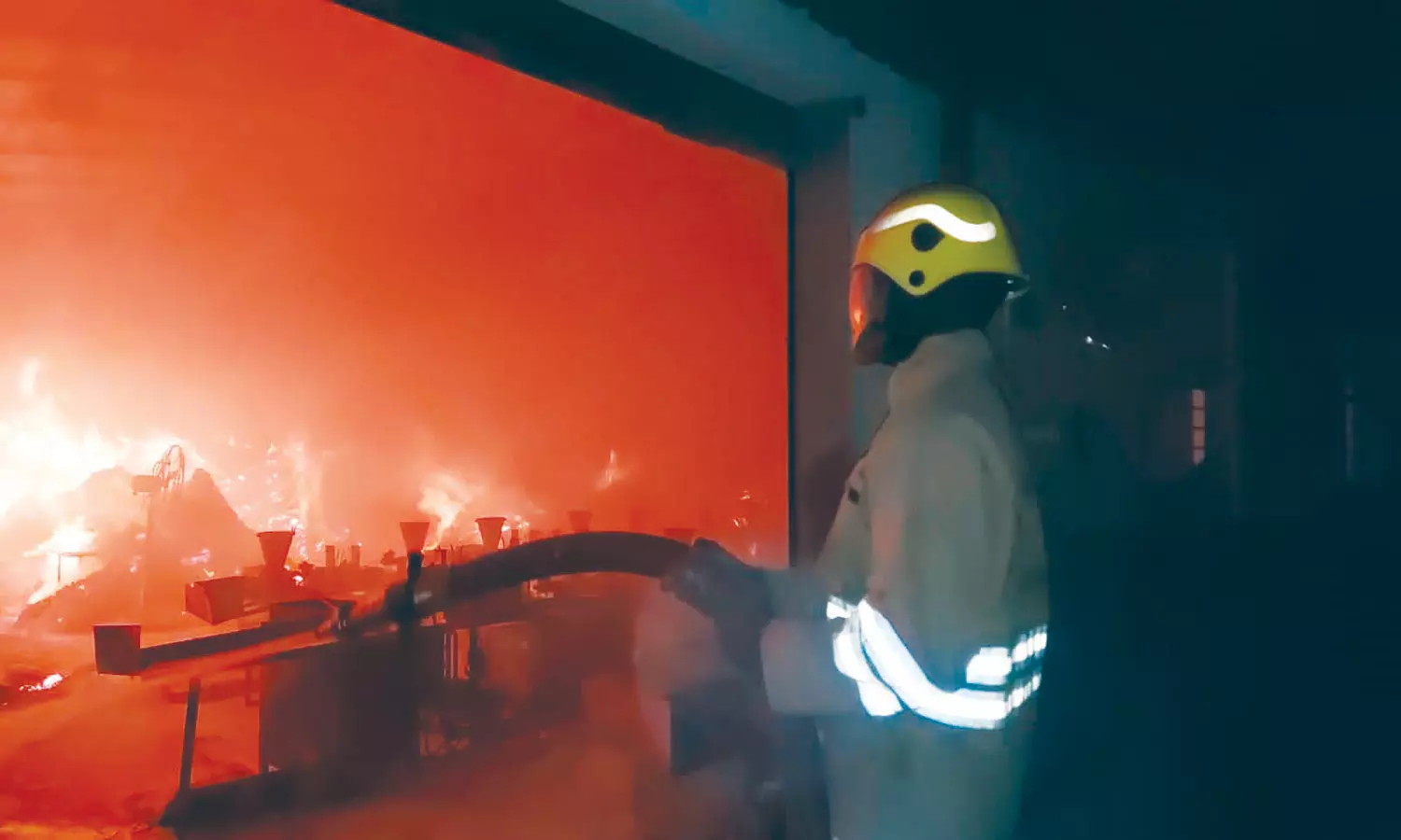 ஊதுபத்தி தொழிற்சாலையில் பற்றி எரிந்த தீயணைப்பு வீரர்கள் தீயை அணைக்கும் காட்சி.