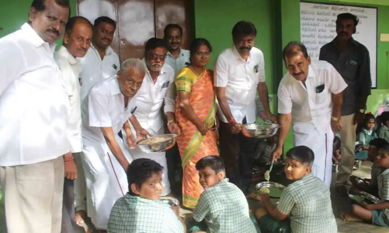மாணவர்களுக்கு உணவு வழங்கப்பட்ட்க் காட்சி.
