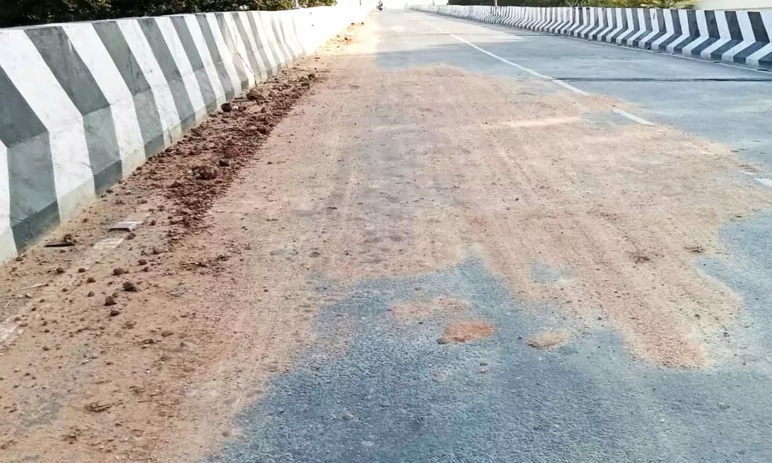 மேம்பாலத்தில் டிப்பர் லாரிகளால் சிதறி கிடக்கும் கற்கள்-மண் துகள்களின் காட்சி.