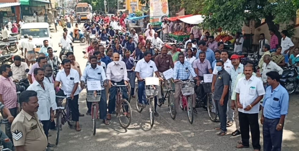 போதை ஒழிப்பு குறித்து சைக்கிள் விழிப்புணர்வு பேரணி நடந்த காட்சி.