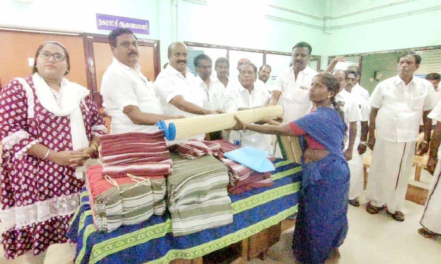 நகராட்சி தூய்மை பணியாளர்களுக்கு பாய் வழங்கிய காட்சி.
