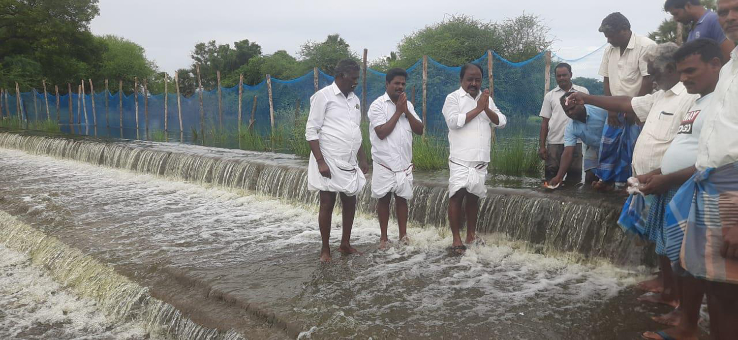 துரிஞ்சாபுரம் ஒன்றியத்துக்கு உட்பட்ட பெரியகிளாம்பாடி ஏரி நிரம்பி வழிந்து ஓடும் தண்ணீரில் சரவணன் எம்.எல்.ஏ. மலர் தூவி வரவேற்றார்.
