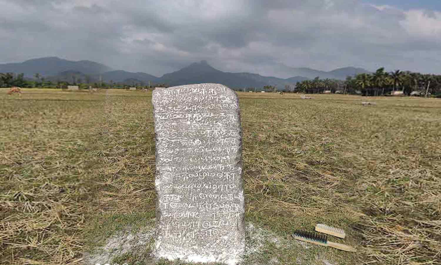 அப்போது காஞ்சி சிவன் கோவில் அருகே வயல்வெளியில் பலகை கல்வெட்டு ஒன்று இருப்பதாக கிடைத்த தகவலின் பேரில் ஆய்வு செய்யப்பட்டது. வயல்வெயிலின் இடையில் பாதி புதைந்த நிலையில் காணப்பட்ட அப்பலகை கல்வெட்டை சுத்தம் செய்து பார்வையிட்டு ஆய்வு செய்தனர்.