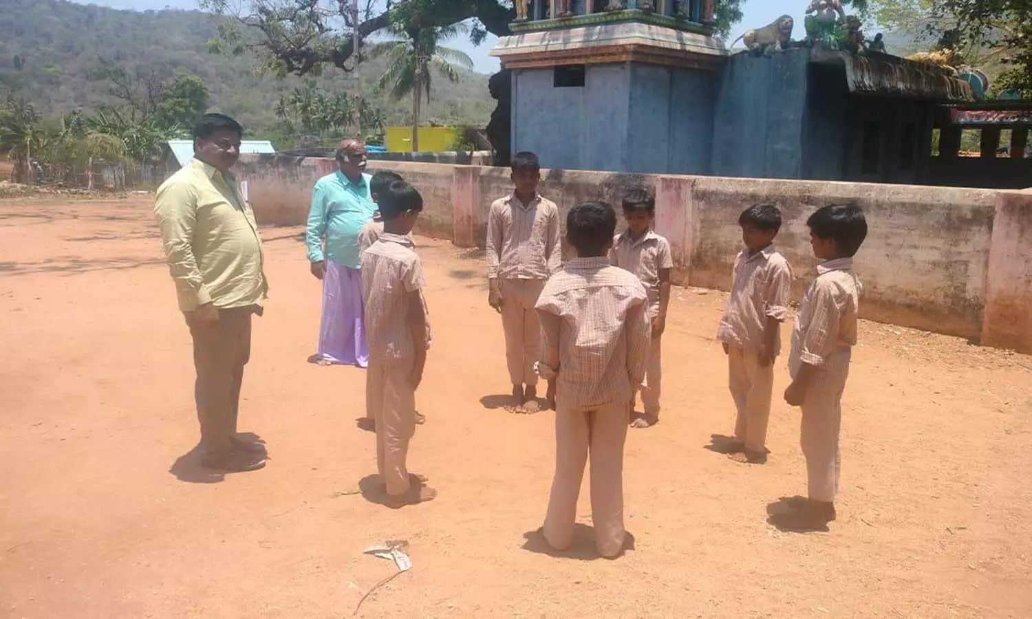 பள்ளி மாணவர்களிடம் நிழல் விழாத நேரம் குறித்து ஆசிரியர் விளக்கம் அளித்த காட்சி.