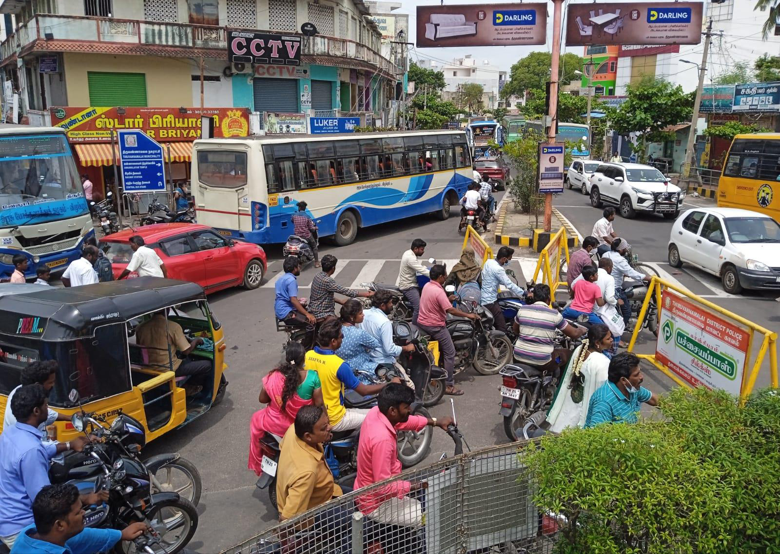 மதியத்தில் போக்கு வரத்து சிக்னல் நிறுத்தப்பட்டதால் பஸ் நிலையம் அருகில் உள்ள ரவுண்டனா பகுதியில் பஸ் நிலையம் அருகில் இருந்து வந்த வாகனங்கள், சின்னக்கடை தெருவில் இருந்து வந்த வாகனங்கள், மத்தலாங்குளத்தெருவில் இருந்த வந்த வாகனங்கள் ஒன்றை ஒன்று முந்தி செல்ல முயன்றபோது போக்குவரத்து பாதிப்பு ஏற்பட்டது.