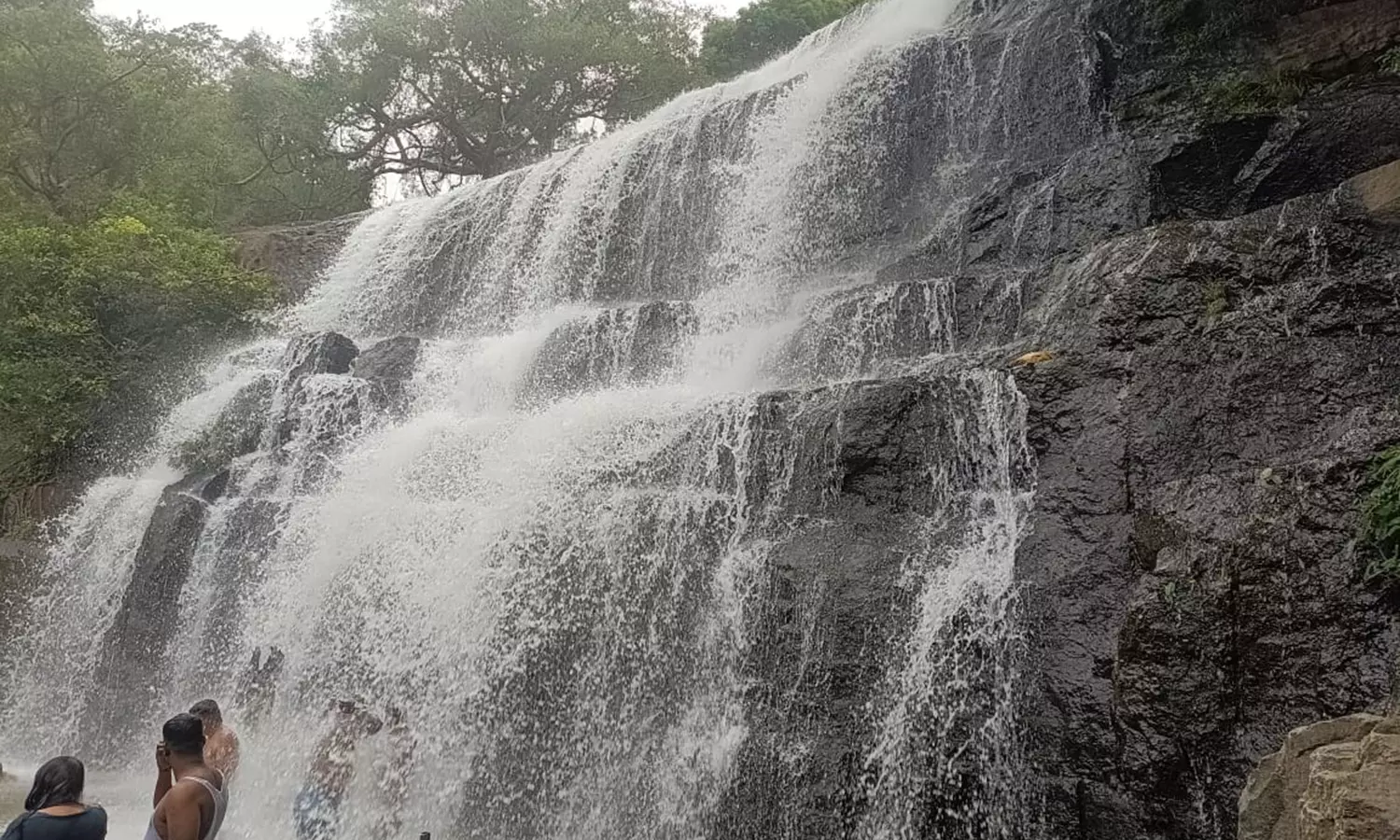 சின்னசுருளி அருவியில் தண்ணீர் ஆர்ப்பரித்து கொட்டுவதால் சுற்றுலா பயணிகள் குளித்து மகிழும் காட்சி.