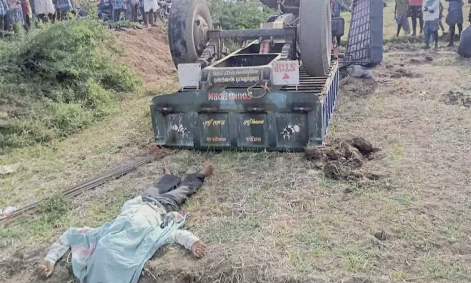 கவிழ்ந்து கிடக்கும் டிராக்டர் மற்றும் பலியான தொழிலாளி.