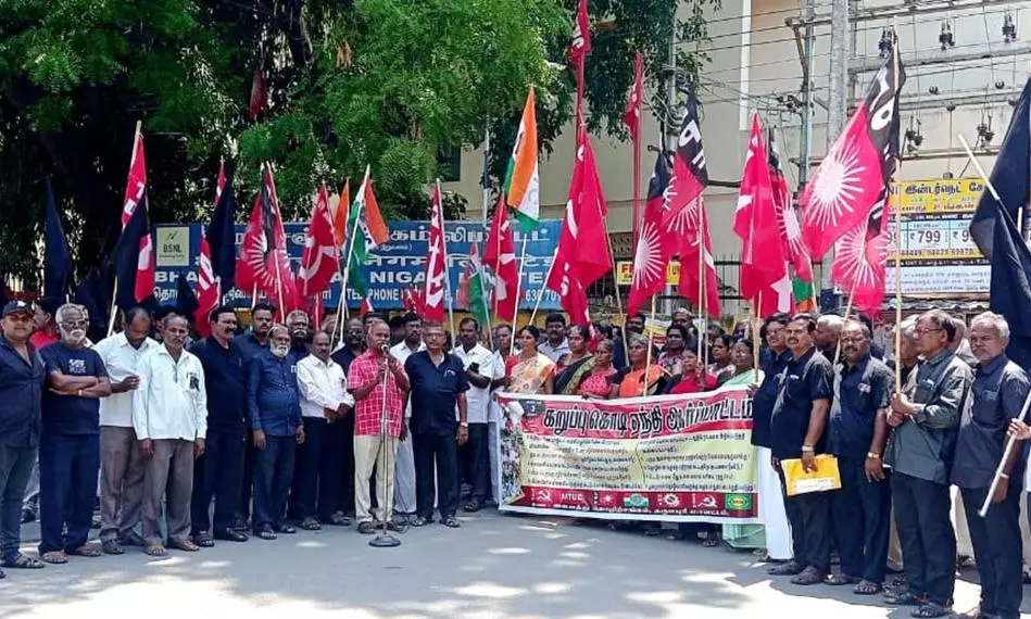 ஆர்ப்பாட்டத்திற்கு சி.ஐ.டி.யு மாநில செயலா ளரும் ஒருங்கிணைப்பாள ருமான சி.நாகராசன் தலைமை வகித்தார். எஸ்.கே.எம் ஒருங்கி ணைப்பாளர் எஸ்.அர்சுணன், ஏ.ஐ.டி.யு.சி மாவட்ட செயலாளர் மணி, சி.ஐ.டி.யு மாவட்ட செயலாளர் ஜீவா, எல்பிஎப் மாவட்ட செயலாளர் அன்புமணி, மாவட்ட செயலாளர் சன்முகராஜா , ஐஎன்டியுசி மாவட்ட தலைவர் சிவலிங்கம், மாவட்ட செயலாளர் சண்முகம், எஸ்எம்எஸ், பேரவை செயலாளர் முருகானந்தம், மாவட்ட செயலாளர் அர்சுணன், ஏஐசிசிடியு மாவட்ட தலைவர் கோவிந்தராஜ், மாவட்ட செயலாளர் முருகன் உள்ளிட்டோர் பேசினர்.