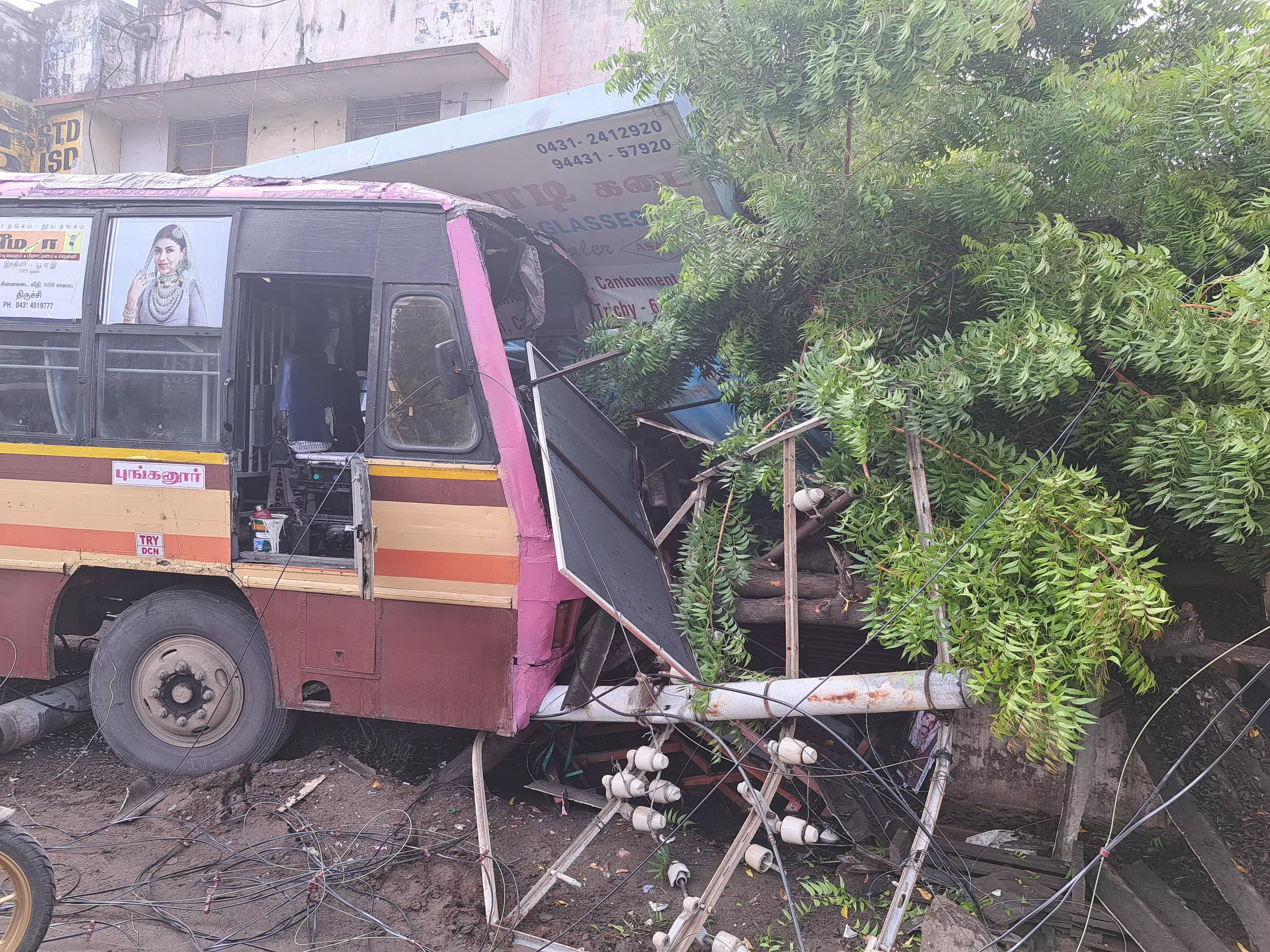 திருச்சி சத்திரம் பஸ் நிலையத்திலிருந்து புங்க னூர் நோக்கி இன்று காலை 7 மணி அளவில் ஒரு அரசு டவுன் பஸ் புறப்பட்டது.இந்த பஸ்ஸை மணப்பா றை எம்ஜிஆர் நகர் பகுதி யைச் சேர்ந்த கணபதி (வயது 56) என்பவர் இயக்கி னார்.இதில் பத்துக்கும் மேற்ப ட்ட பயணிகள் இருந்தனர். இந்த பஸ் திருச்சி தலைமை தபால் நிலையம் தாண்டி அங்குள்ள ஆர்சி பள்ளி வேகத்தடை பகுதிக்கு வந்த போது டிரைவருக்கு திடீர் நெஞ்சுவலி ஏற்பட்டு பஸ் கட்டுப்பாட்டை இழந்தது.பின்னர் சாலையோரம் உள்ள தொலைபேசி கம்ப த்தை இடித்து க்கொண்டு அங்குள்ள கடைக்குள் புகு ந்தது. காலை நேரம் என்ப தால் அந்தக் கடைகள் பூட்ட ப்பட்டிருந்தது.அதேபோன்று அங்குள்ள பஸ் நிறுத்தத்தில் பஸ்ஸுக்கு காத்திருந்த பெண்களும் பஸ் தாறுமாறாக ஓடி வருவதை கண்டு அதிர்ச்சி அடைந்து அலறி அடித்து ஓடி தப்பினர்.பஸ் விபத்தில் சிக்கிய சத்தம் கேட்டு அருகில் இரு ந்தவர்கள் ஓடி வந்து ஸ்டியரிங்கை பிடித்தபடி சாய்ந்து கிடந்த டிரைவரை மீட்டு திருச்சி அரசு மருத்து வமனைக்கு அனுப்பி வைத்தனர்.அங்கு டாக்டர்கள் பரிசோ தித்து விட்டு அவர் ஏற்க னவே இறந்து விட்டதாக தெரிவித்தனர்.இந்த விபத்தில் அதிர்ஷ்ட வசமாக பயணிகள் யாரு க்கும் காயம் ஏற்படவில்லை.சில மாதங்களுக்கு முன்பு இதே பகுதியில் வேகத்த டையில் ஏறி இறங்கிய தனியார் பஸ் தாறுமாறாக ஓடி அங்குள்ள பெட்ரோல் பங்கில் புகுந்து விபத்து ஏற்படுத்தியது.இதில் அப்பகுதி ரயில்வே குடியிருப்பில் வசித்த ரயில்வே ஊழியர் சிக்கி பரிதாபமாக இறந்தார்.இந்தப் பகுதியில் அடி க்கடி விபத்து ஏற்படுவதால் அந்தப் பகுதியில் உள்ள ஆக்கிரமிப்புகளை அகற்றி நடவடிக்கை எடுக்க வேண்டும் என கோரிக்கை விடுத்துள்ளனர்.விபத்து பற்றிய தகவல் அறிந்த திருச்சி மாநகராட்சி 53வது வார்டு கவுன்சிலர் ஜெ. கலைச்செல்வி விரை ந்து வந்து மீட்பு பணிகளை முடுக்கி விட்டார்.