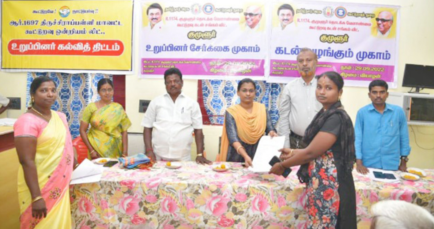 திருச்சி மாவட்டம் குமுளூர் தொடக்க வேளாண்மை கூட்டுறவு கடன் சங்கத்தில் திருச்சி மாவட்ட கூட்டுறவு ஒன்றியம் மூலம் உறுப்பினர் கல்வி திட்டம், புதிய உறுப்பினர் சேர்க்கை முகாம் மற்றும் கடன் வழங்கும் முகாம் நடைபெற்றது. நிகழ்ச்சியில் லால்குடி சரக துணைப்பதிவாளர் ரா.திவ்யா கலந்துகொண்டு கூட்டுறவு சங்கங்களில் உறுப்பினர்கள் சேர்க்கைக்கான புதிய உறுப்பிர் சேர்க்கை விண்ணப்பங்களை வழங்கினார். இந்த சங்கத்தில் 197 நபர்களுக்கு ரூ.1.64 கோடி விவசாய கடன்கள் வழங்கப்பட்டுள்ளது.