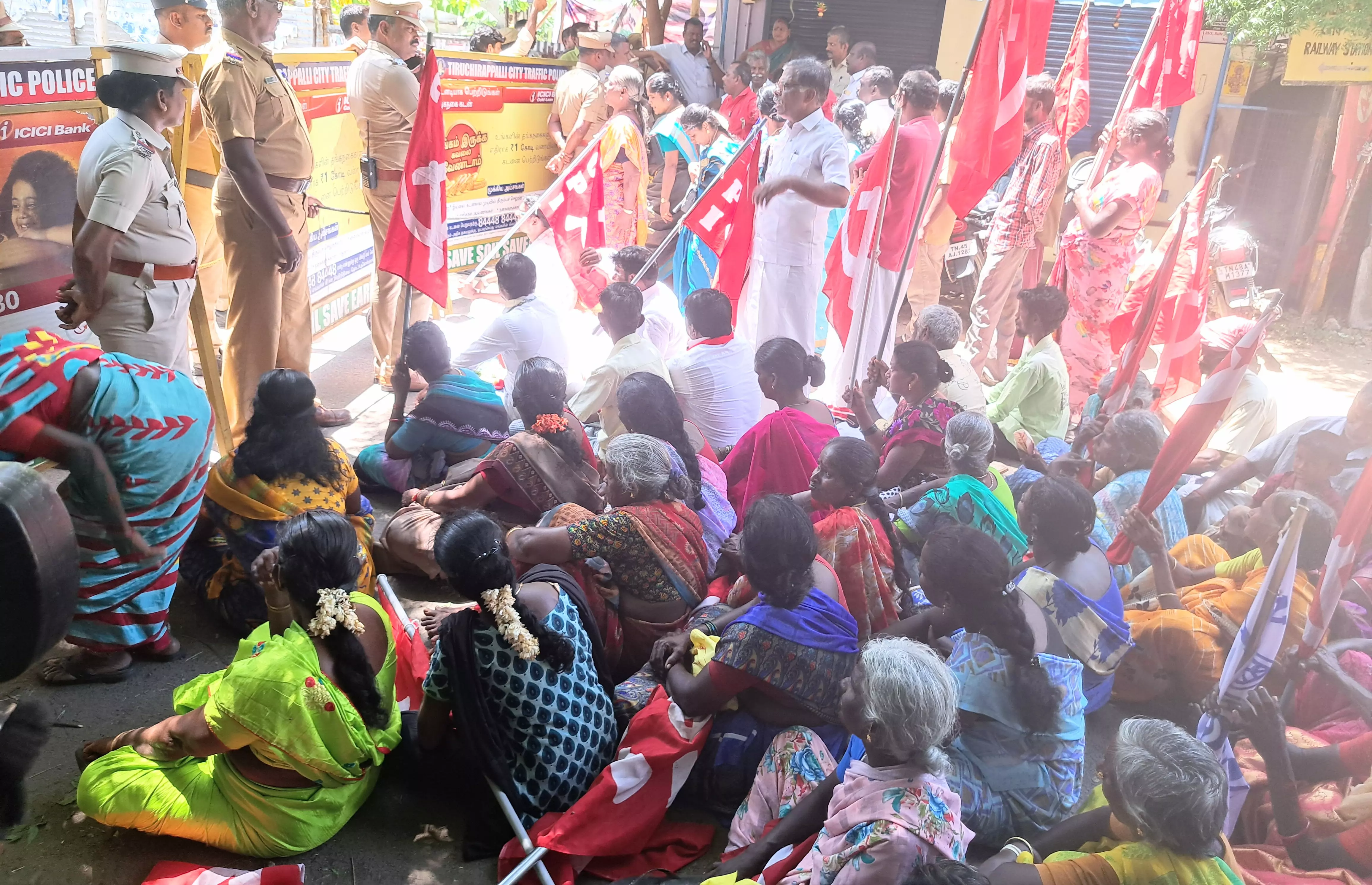 பெட்ரோல் விலை, டீசல் விலை, அத்தியாவசிய பொருட்களின் விலை ஆகி யவற்றை குறைக்க வேண் டும்.இந்தியை திணித்து தமிழு க்கு எதிராக செயல்படுவதை கைவிட வேண்டும். வேலை யில்லா திண்டாட்டத்தை போக்க வேண்டும்.சாதி, மத கலவரங்களை தூண்டி, மக்கள் ஒருமைப்பா ட்டை குலைத்து, நாட்டை நாசமாக்கும் பாஜக அரசு, ஆட்சியை விட்டு வெளியேற வேண்டும் என்பன உள்ளி ட்ட கோரிக்கைகளை வலியு றுத்தி இன்று தமிழகம் முழுவதும் இரண்டாவது நாளாக இந்திய கம்யூனிஸ்ட் கட்சியினர் தொடர் போரா ட்டத்தில் ஈடுபட்டுள்ளனர்.இதன் ஒரு பகுதியாக முதல் நாள் போராட்டமான நேற்று, திருச்சி இரயில்வே சந்திப்பில் சட்டமன்ற முன் ளாள் உறுப்பினர் பத்மாவதி தலைமையில் போராட்டம் நடத்திய நூற்றுக்கு மேற்ப ட்டோர் கைது செய்யப்பட்டு விடுவிக்கப்பட்டனர்.இரண்டாவது நாளான இன்று, திருச்சி திருவரங்கம் ரெயில் நிலையத்தில் மறி யல் போராட்டம்சி.ஐ.டி.யூ. மாவட்ட பொதுச் செயலாளரும், கவுன்சிலருமான சுரேஷ் தலைமையில் நடைபெற்றது. மறியல் போராட்டத்தில் பொதுச் செயலாளர் பார் வதி மாவட்ட பொருளாளர் சண்முகம் தேசிய கட்டுப்பா ட்டு குழு செல்வராஜ் மாணவர் மாவட்ட செயலா ளர் எஸ் சிவா பகுதி செயலாளர்கள் சுரேஷ் முத்துசாமிஅஞ்சுகம் செம்பட்டு ராஜா அபுதாகிர் மாதர் சந்திரன மாநகர தலைவர் ஆயிஷா மாணவர் பெருமன்ற செயலாளர்கள் மற்றும் 100 -க்கும் மேற்ப ட்டோர் கலந்து கொண்டு கைதாகினர். அப்போது போலீசாருக்கும், போராட்ட க்காரர்களுக்கும் இடையே மோதல்- தள்ளுமுள்ளு ஏற்பட்டது. இதனால் அங்கு சிறிது நேரம் பரபரப்பு நிலவியது.