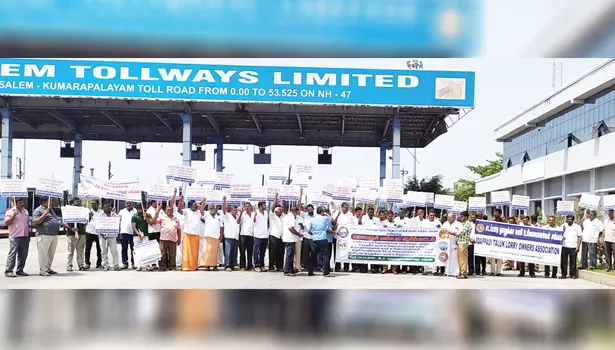 சங்ககிரி அருகே வைகுந்தம் சுங்கச்சாவடி முன்பு, மாநில லாரி உரிமையாளர்கள் சம்மேளனம் சார்பில் ஆர்ப்பாட்டம் நடந்தபோது எடுத்த படம்.