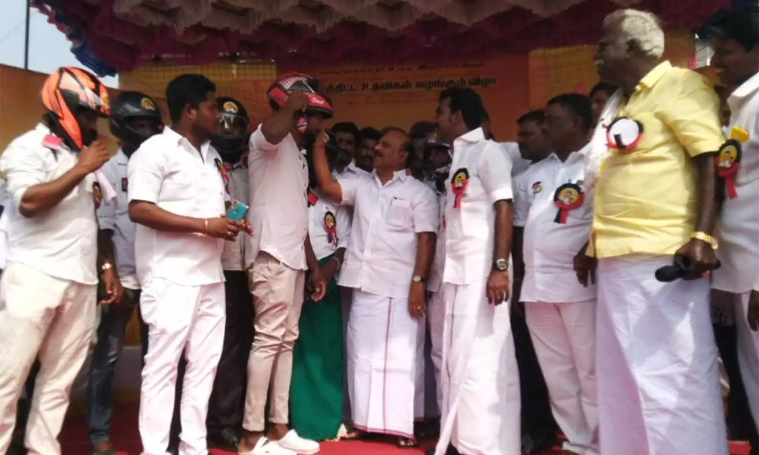 இளைஞர் ஒருவருக்கு தலைக்கவசம் அணிவித்த அமைச்சர் தா.மோ.அன்பரசன்