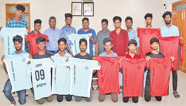 கைப்பந்து வீரர்களுக்கு சீருடை வழங்கப்பட்ட காட்சி.