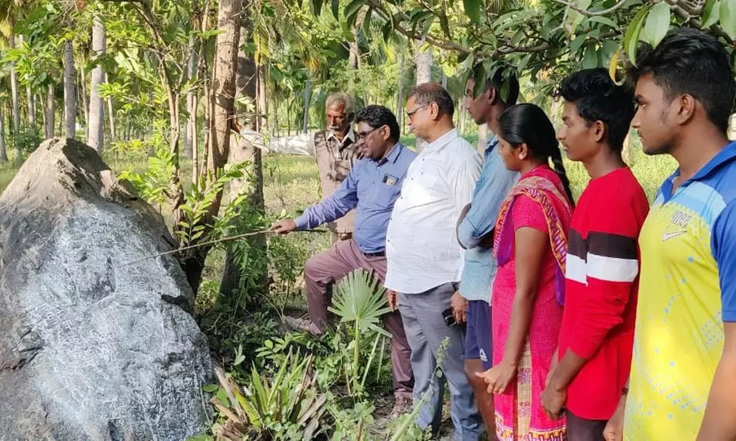 ஊத்தங்கரையை அடுத்த உப்பாரப்பட்டியில் 800 ஆண்டுகள் பழமையான கல்வெட்டை பார்வையிடும் வரலாற்று ஆய்வாளர்கள்.