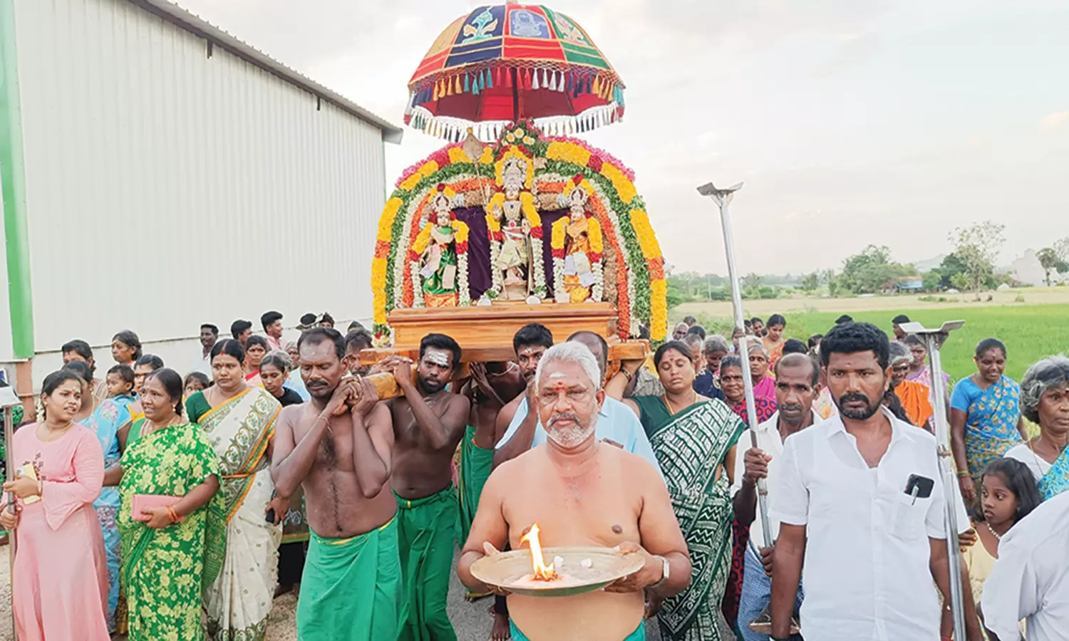 பின்னர், வழிநெடுகிலும் திரண்டிருந்த பக்தர்களின் பெரும் வெள்ளத்தில் தாரை தப்பட்டை முழங்க, கோலாட்டம், மயிலாட்டாம், பொய்கால் குதிரை, சிலம்பம் போன்றவைகளின் முன்பாக அம்மன் சிரசு ஊர்வலமாக சென்றது.