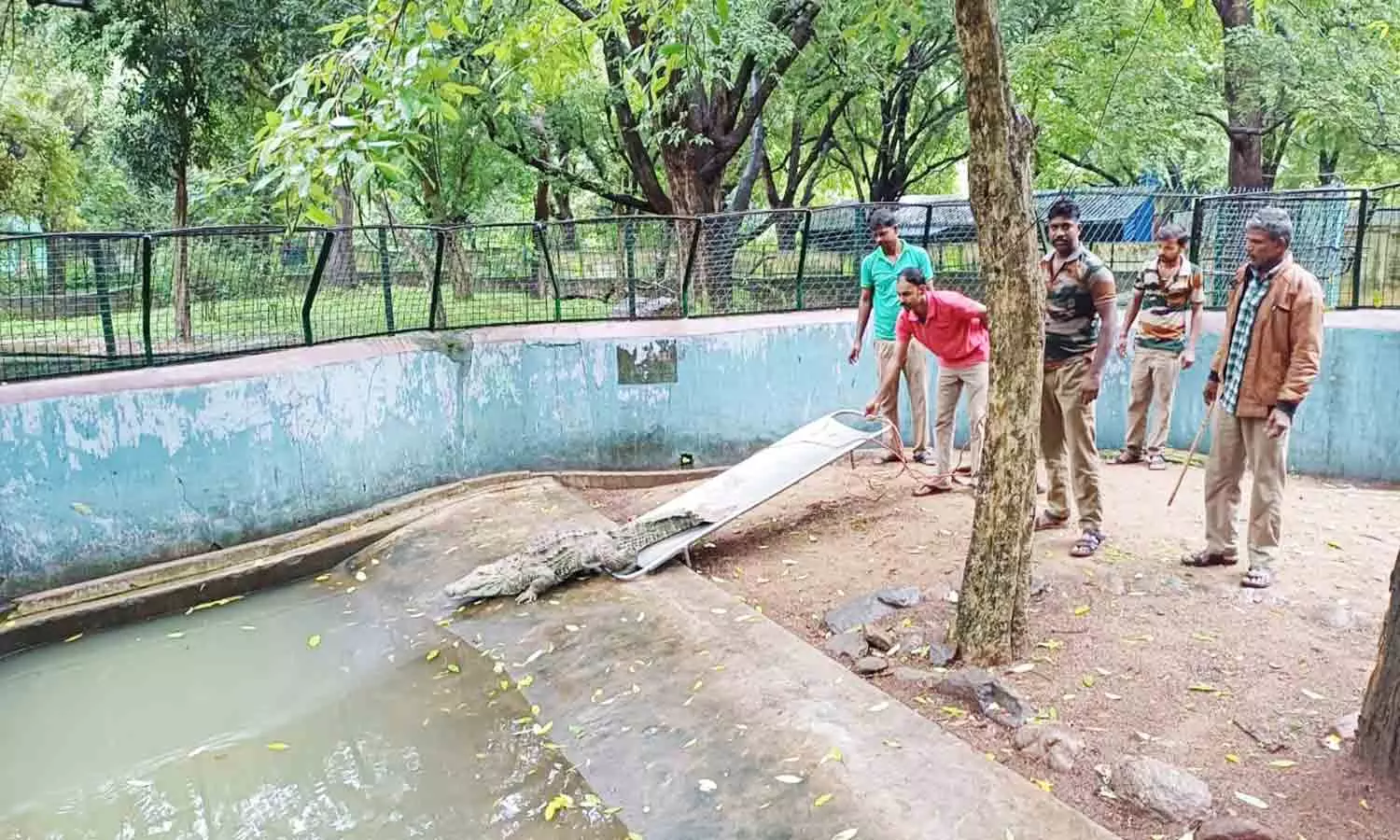 கோவையில் இருந்து கொண்டுவரப்பட்ட முதலைகள் அமிர்தி பூங்காவில் விடப்பட்ட காட்சி.