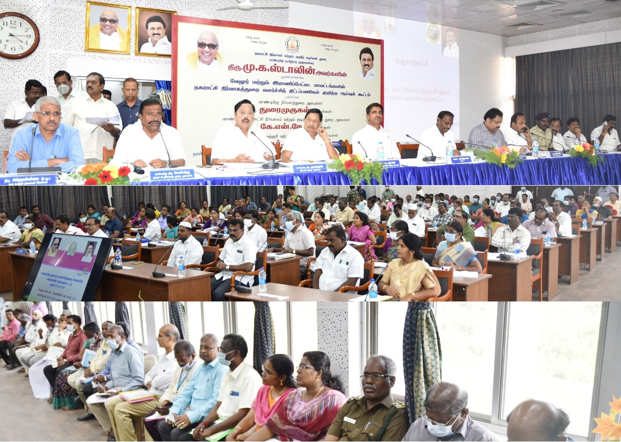 இதில் அமைச்சர்கள் துரைமுருகன், கே.என்.நேரு, ஆர்.காந்தி ஆகியோர் கலந்து கொண்டு வேலூர் ராணிப்பேட்டை மாவட்டத்தில் மாநகராட்சி நகராட்சி பகுதிகளில் செய்யப்பட்டுள்ள பணிகள் குறித்து ஆய்வு செய்தனர்.