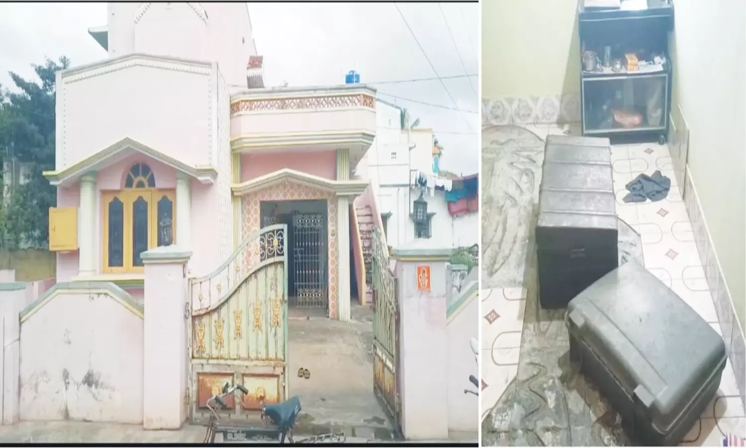 கொள்ளை நடந்த வீடு மற்றும் சிதறி கிடந்த பொருட்கள்.