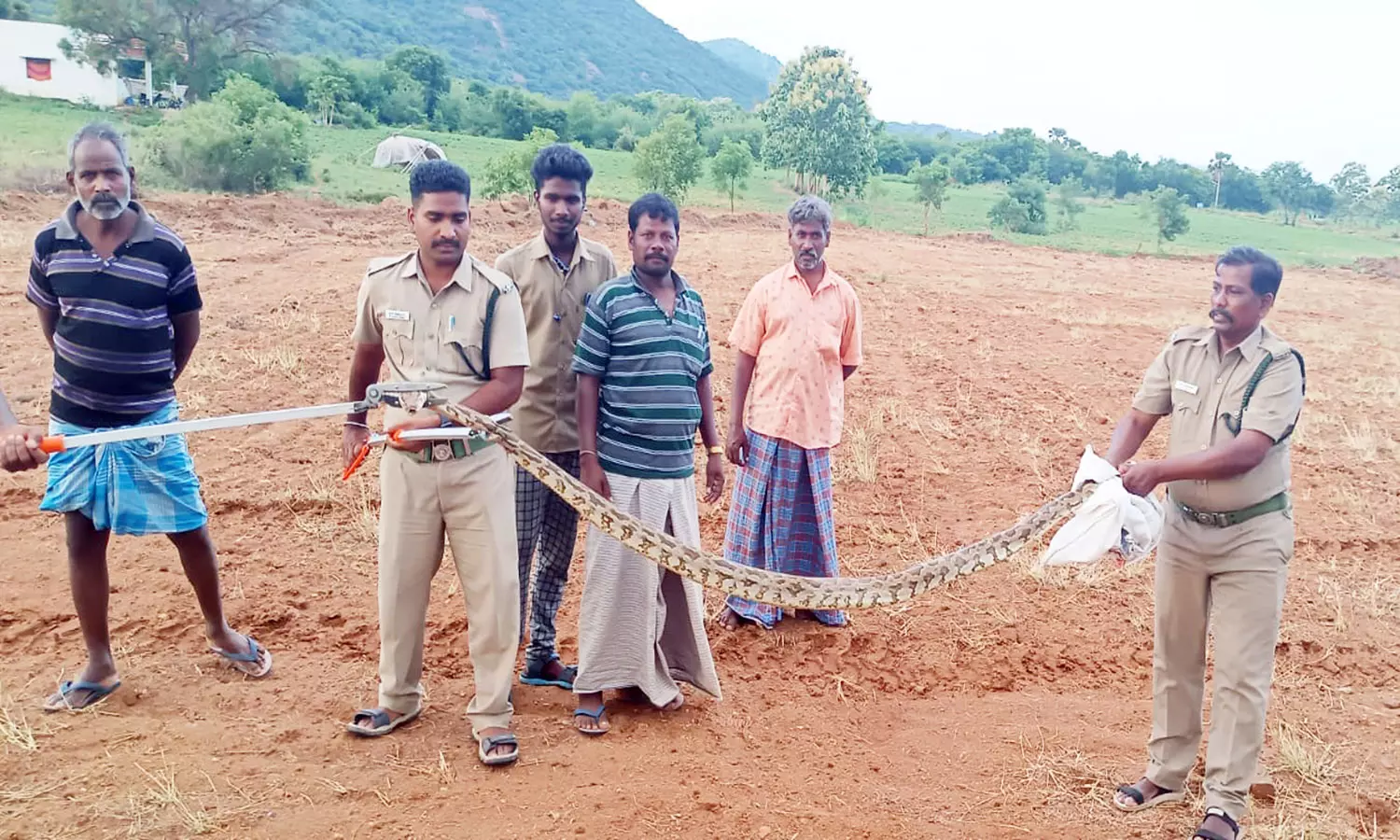 தகவலறிந்து விரைந்து வந்த வனச்சரகர் இந்து தலைமையிலான குழுவினர் உடனடியாக 10 அடி நீளம் கொண்ட மலை பாம்பை மீட்டு அருகே உள்ள சாணம் குப்பம் காப்பு காட்டில் பத்திரமாக விட்டனர்.
