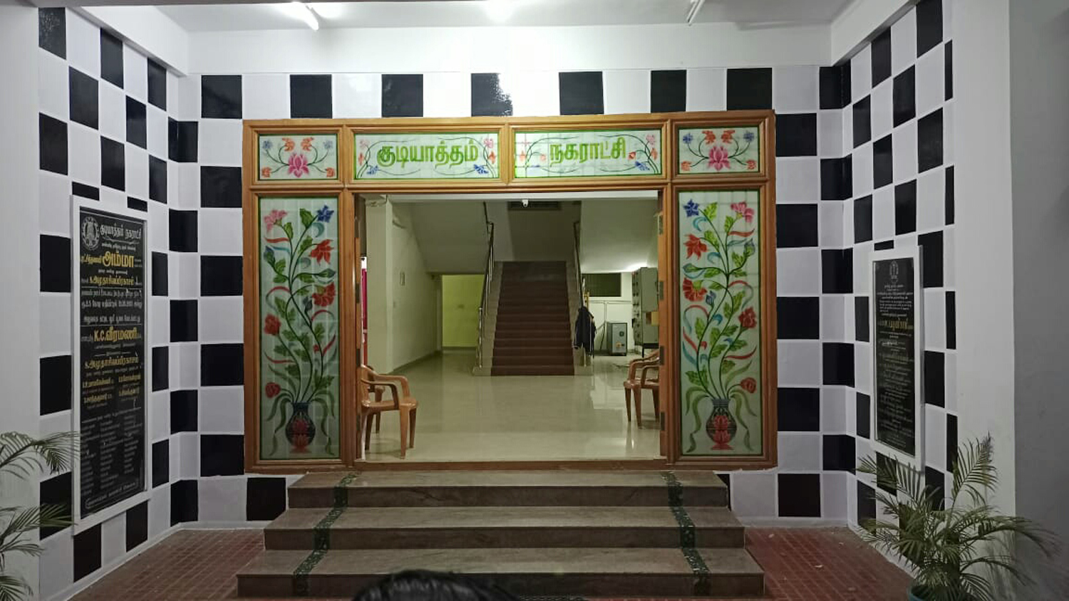 செஸ் வடிவமைப்பில் நகராட்சி நுழைவு வாயிலில் வர்ணம் தீட்டப்பட்ட காட்சி.