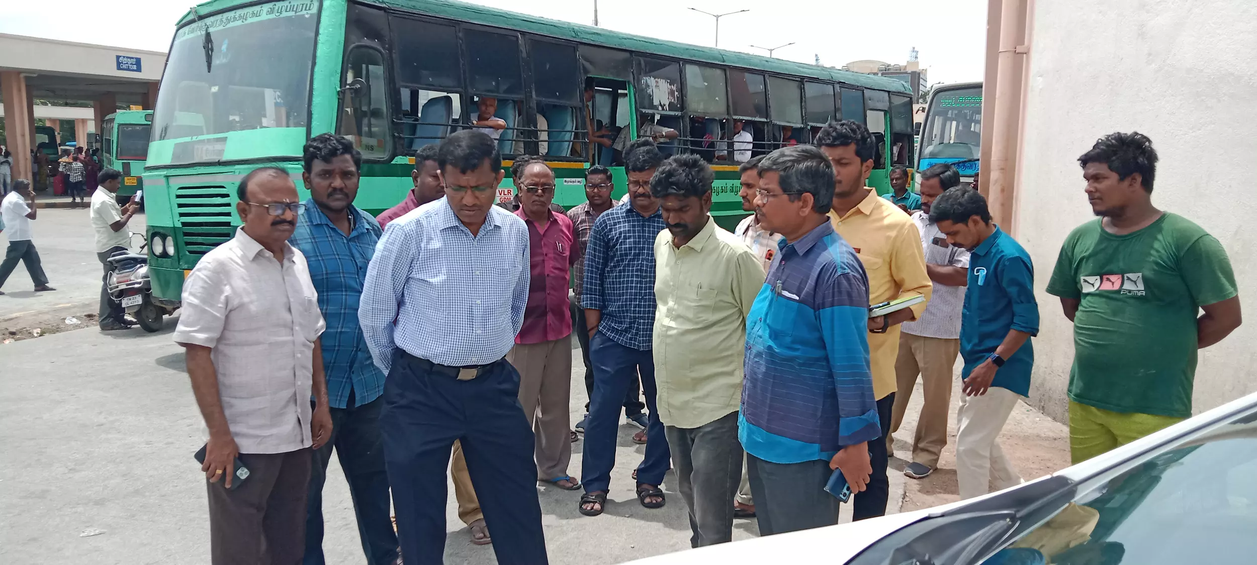 வேலூர் புதிய பஸ் நிலையத்தில் மாநகராட்சி கமிஷனர் ரத்தினசாமி ஆய்வு செய்த காட்சி.