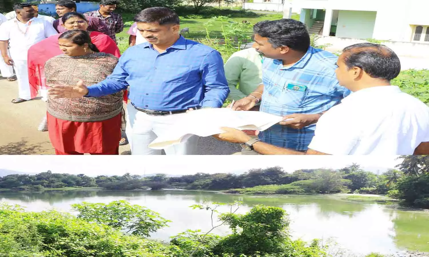 பலவன்சாத்து ஏரி சீரமைப்பது குறித்து கலெக்டர் குமாரவேல் பாண்டியன் ஆய்வு செய்த காட்சி. உடன் மாவட்ட வருவாய் அலுவலர் மாலதி, உதவி கலெக்டர் கவிதா, தாசில்தார் செந்தில்.