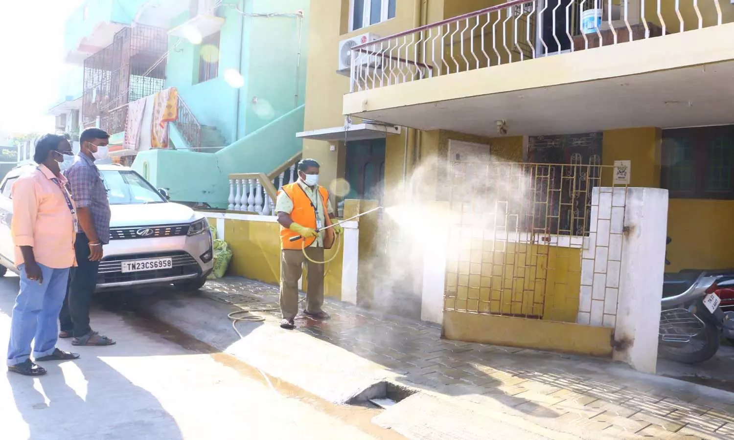 சத்துவாச்சாரி நேதாஜி நகரில் உள்ள வீட்டிற்கு மாநகராட்சி ஊழியர்கள் கிருமி நாசினி தெளித்த காட்சி.