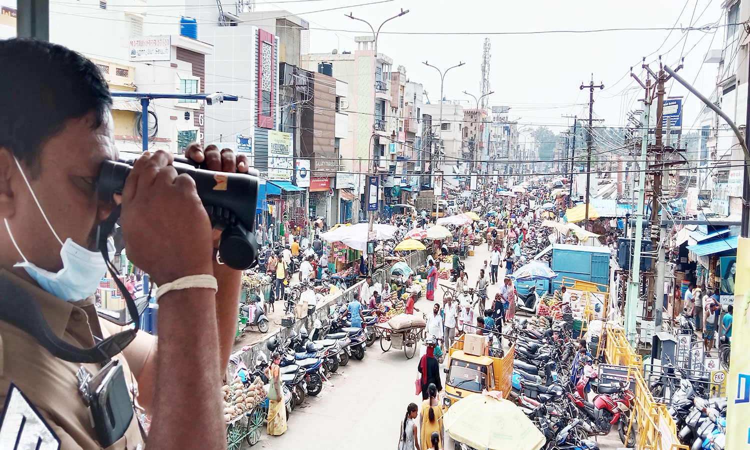 தீபாவளி பண்டிகைக்கு பொருட்கள் வாங்க ஏராளமான பொதுமக்கள் வருவதால் லாங்கு பஜாரில் கண்காணிப்பு கோபுரத்தில் இருந்து போலீசார் கண்காணிப்பு பணியில் ஈடுபட்டனர்.