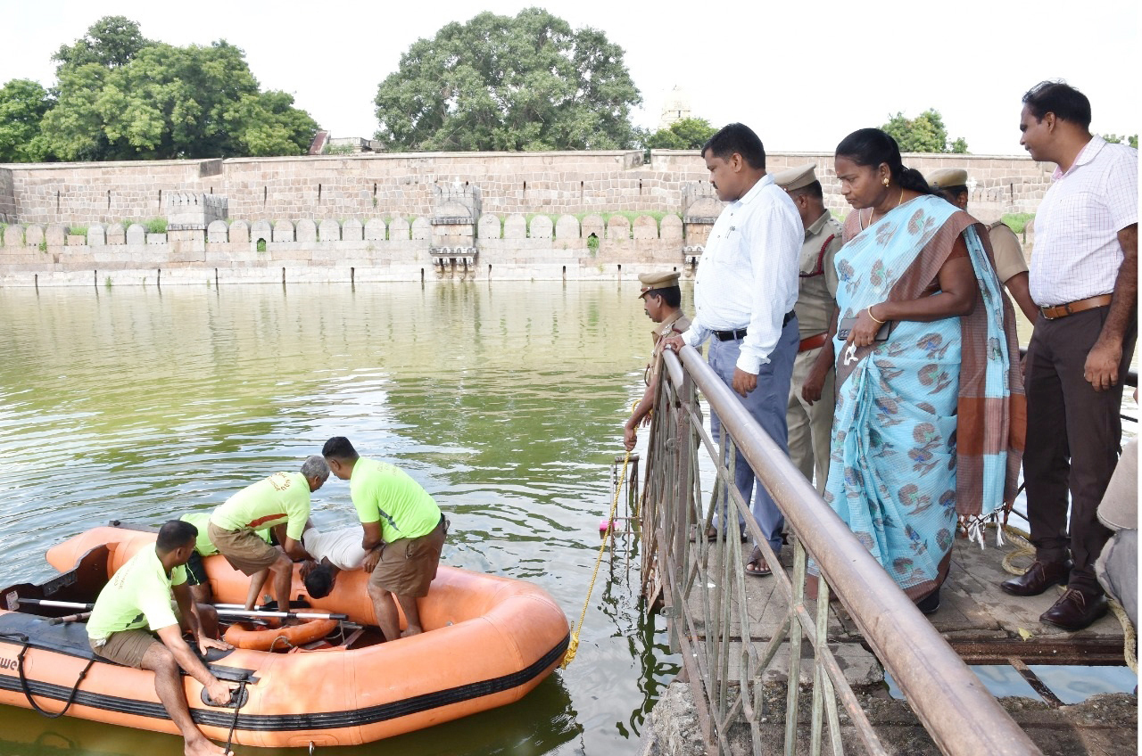 வேலூர் கோட்டை அகழியில் வெள்ள பாதிப்பு மீட்பு ஒத்திகை நடந்த காட்சி.