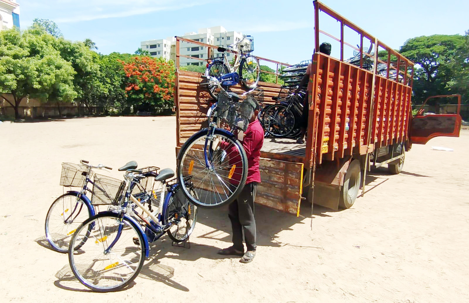 வேலூர் கோடையிடி குப்புசாமி மேல்நிலைப்பள்ளியில் மாணவர்களுக்கு வழங்குவதற்காக இலவச சைக்கிள் இறக்கப்பட்ட காட்சி.