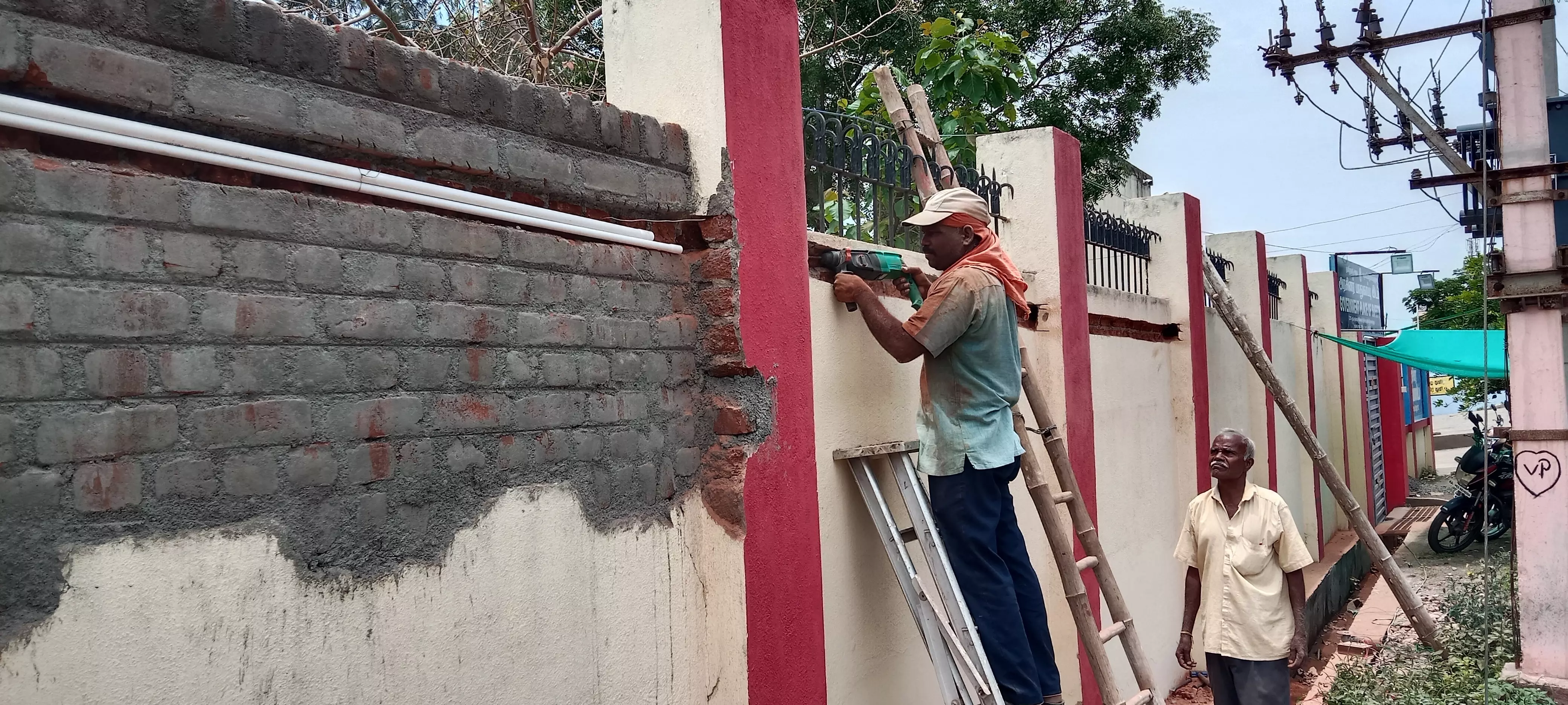 பாதுகாப்பு இல்ல மதில் சுவர் உயரம் அதிகரிப்பு பணி நடந்து வரும் காட்சி.