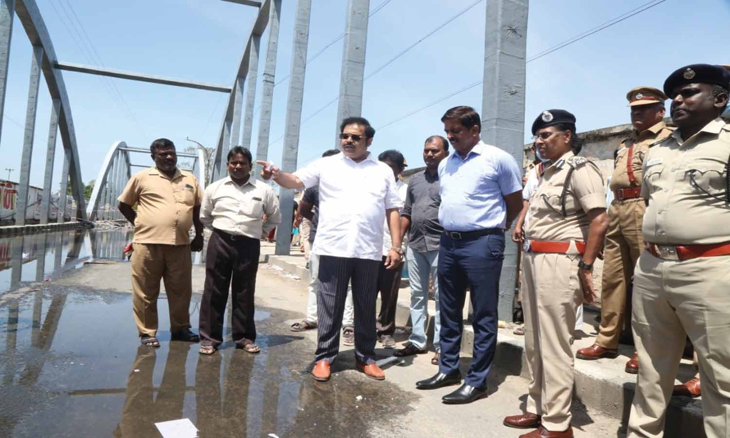 காட்பாடி ரெயில்வே மேம்பால சீரமைப்பு பணிகளை கதிர் ஆனந்த் எம்.பி.,கலெக்டர்குமாரவேல் பாண்டியன், டி.ஐ.ஜி. ஆனி விஜயா போலீஸ் சூப்பிரண்டு ராஜேஷ் கண்ணன் ஆகியோர் ஆய்வு செய்த காட்சி.