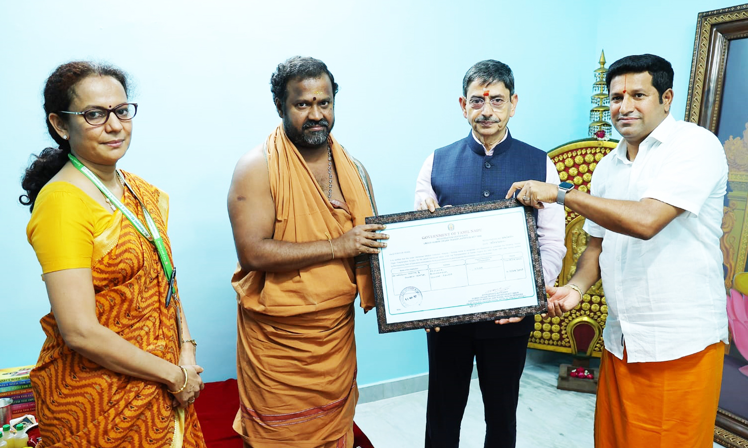 வேலூர் ஸ்ரீபுரம் ஸ்ரீநாராயணி மருத்துவமனையில், கல்லீரல் நோய்கள் மற்றும் கல்லீரல் மாற்று அறுவை சிகிச்சைக்கான தமிழக அரசின் அங்கீகாரத்தை, சக்தி அம்மா மற்றும் கவர்னர் ஆர்.என்.ரவி ஆகியோர் மருத்துவமனை இயக்குனர் பாலாஜியிடம் வழங்கினர். அருகில் மருத்துவமனை துணை கண்காணிப்பாளர் கீதா இனியன்.