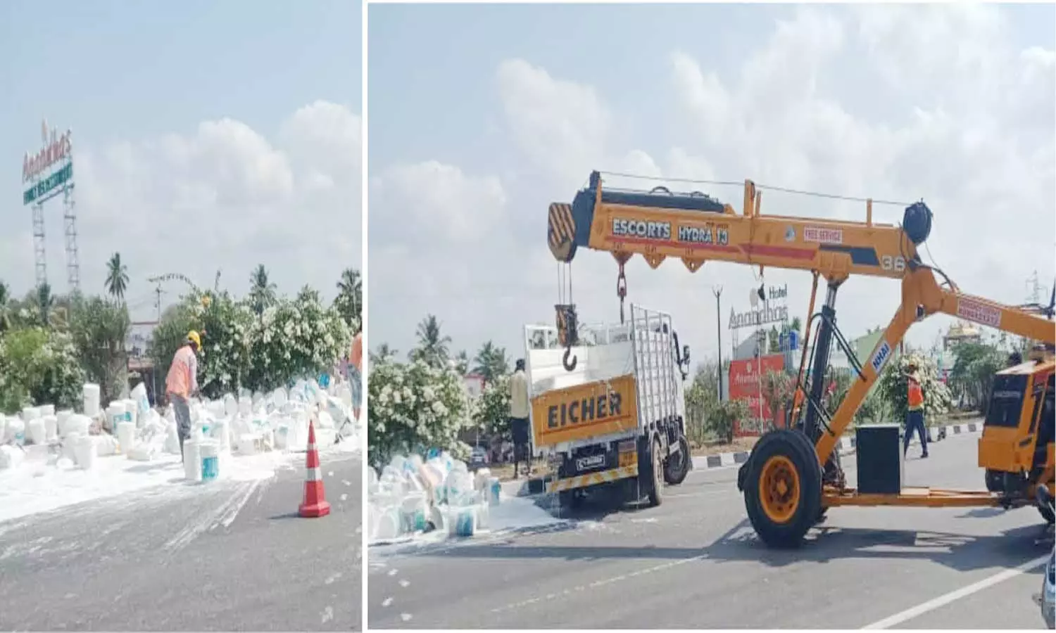 சாலையில் கொட்டிய பெயிண்டையும், மினி வேைனயும் பொக்லைன் எந்திரம் மூலம் அப்புறப்படுத்துவதை படத்தில் காணலாம்.