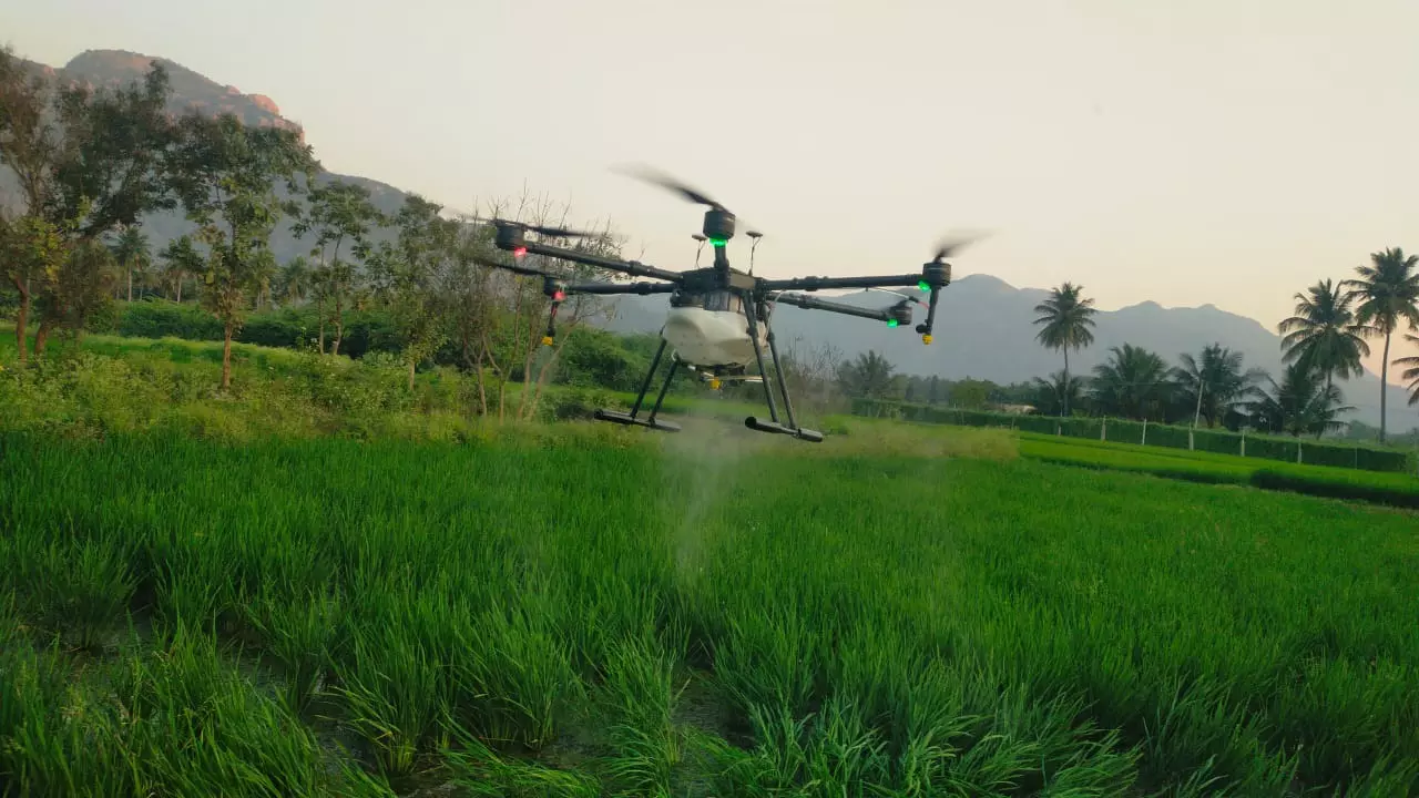 விளை நிலங்களில் டிரோன் மூலம் பூச்சி மருந்து தெளிப்பு