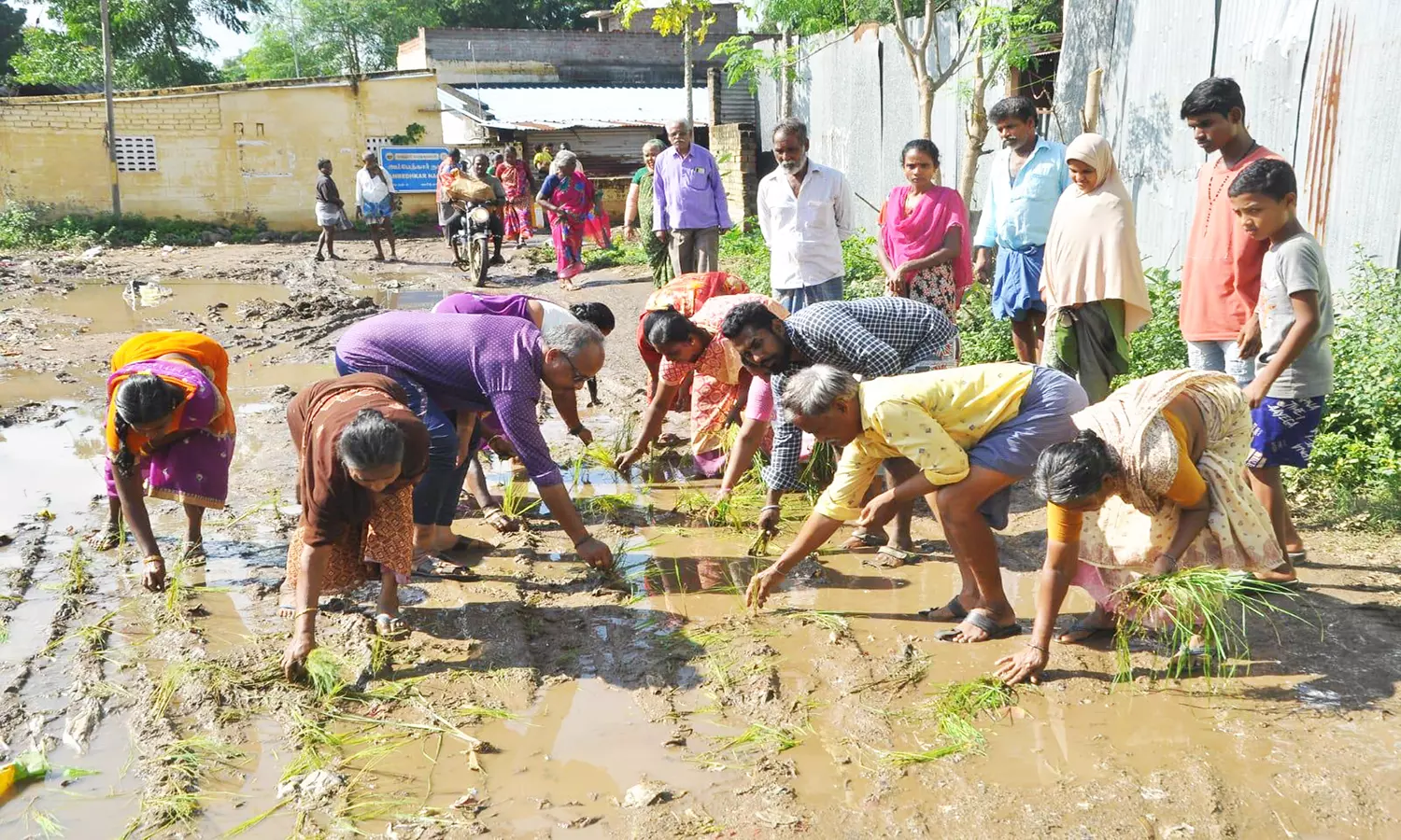 பொதுமக்கள் நாற்று நடும் போராட்டத்தில் ஈடுபட்ட காட்சி.