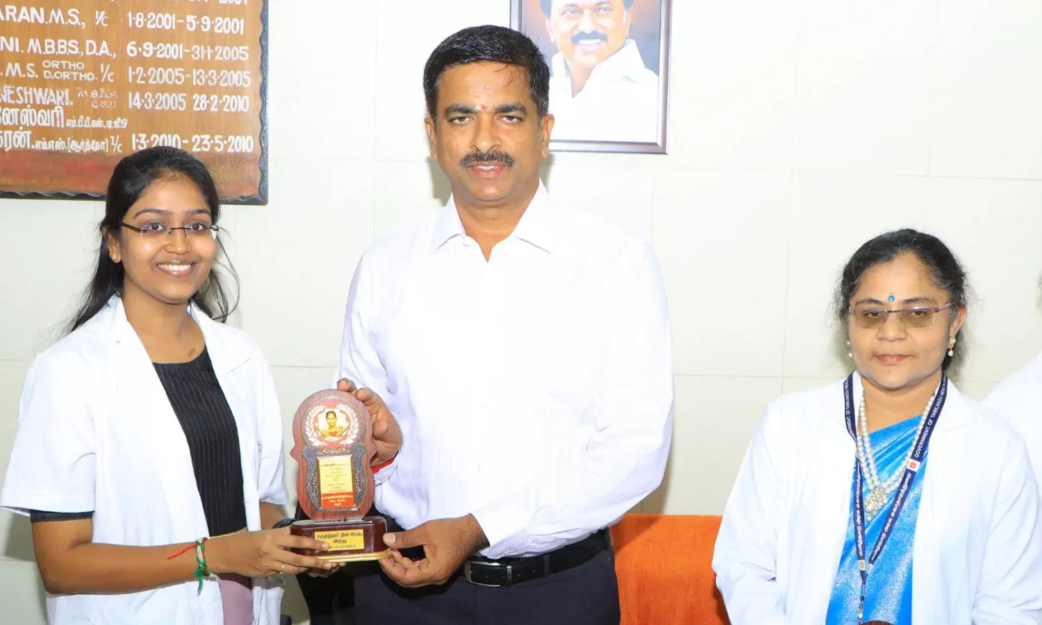 மருத்துவர்கள் தினத்தை முன்னிட்டு வேலூர் இ.எஸ்.ஐ. மருத்துவமனையில் சிறப்பாக பணிபுரிந்த டாக்டர்களுக்கு கலெக்டர் குமாரவேல் பாண்டியன் கேடயம் வழங்கிய காட்சி.