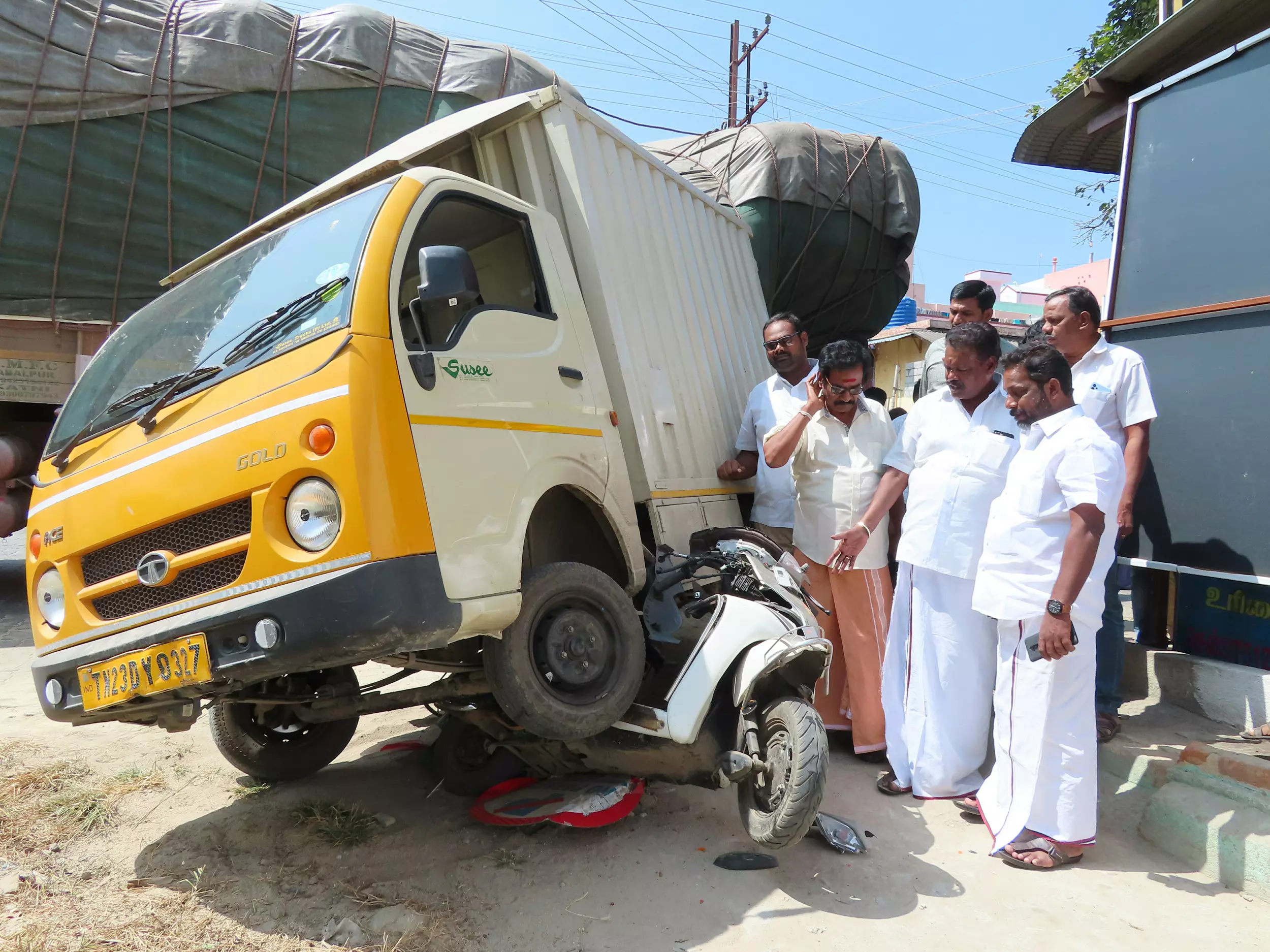 அப்போது அந்த சரக்கு வாகனம் மொபட் மேல் ஏறி இறங்கி நசுக்கியது. இதனால் மொபட்டை எடுக்க சென்ற விஜயன் அதிர்ச்சியில் உறைந்தார் மயிரிழையில் காயங்கள் இன்றி தப்பினார்.
