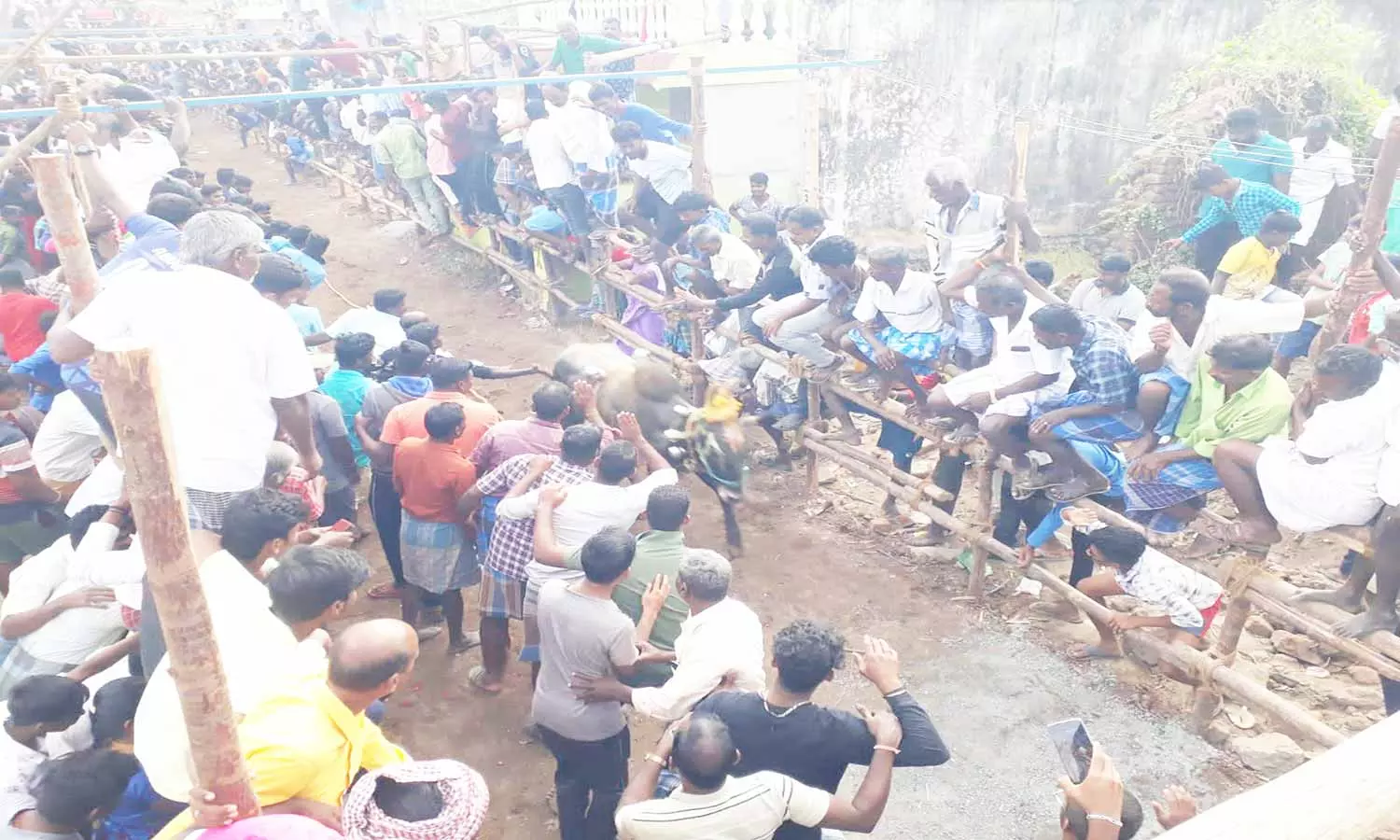 காளைகள் சீறிப்பாய்ந்து ஓடிய காட்சி.
