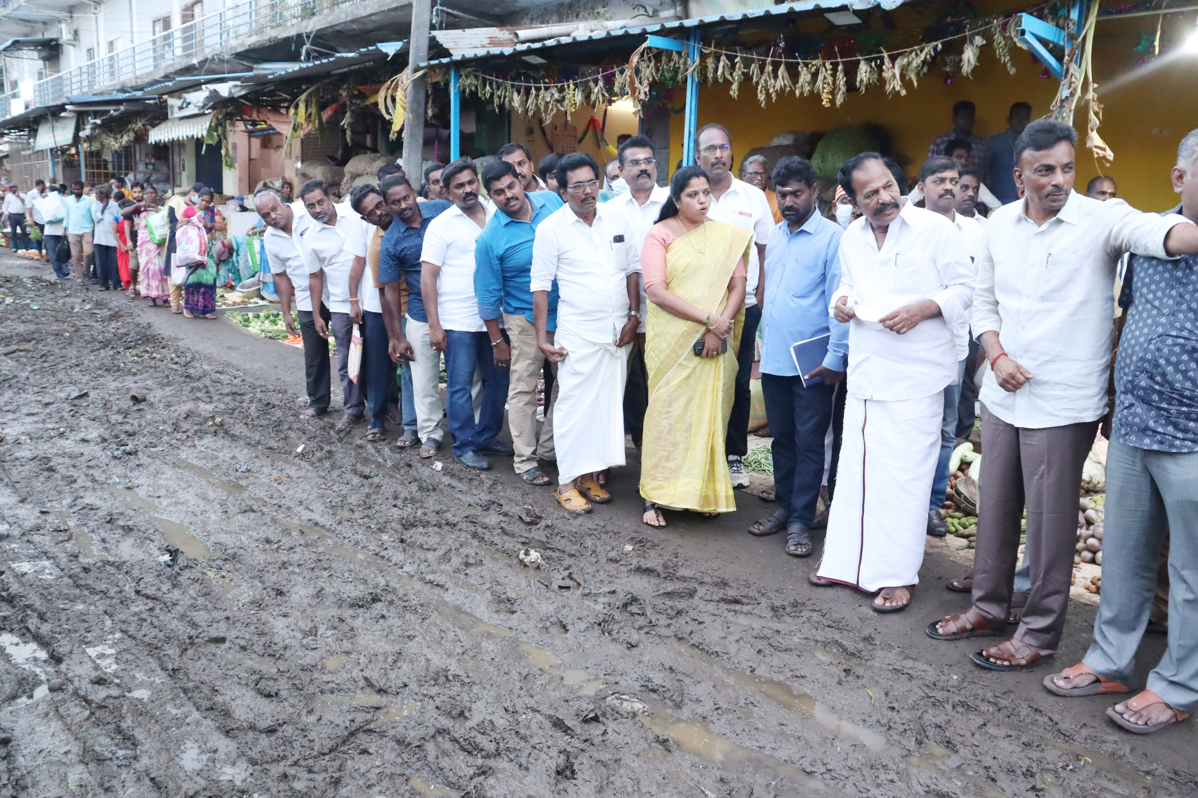 மேலும் மழை காரணமாக அப்பகுதி சேறும், சகதியு மாக பொதுமக்கள் நடந்து செல்ல முடியாத நிலையில் காணப்பட்டது. அதைப் பார்த்த எம்.எல்.ஏ., மேயர் ஆகியோர், மார்க்கெட்டில் சேகரமாகும் அழுகிய காய் கறிகள், குப்பைகளை தினமும் சேகரித்துச் செல்லும் படி மாநகராட்சி ஊழிய ர்களுக்கு உத்தரவிட்டனர்.