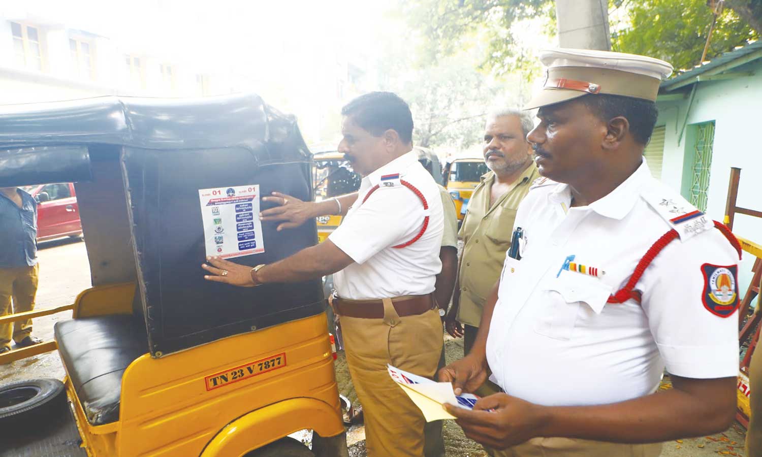 ஆட்டோக்களில் ஸ்டிக்கர் ஒட்டும் பணியை போக்குவரத்து போலீஸ் இன்ஸ்பெக்டர் நடராஜன் தொடங்கி வைத்தார். தொடர்ந்து ஆட்டோக்களுக்கு ஸ்டிக்கர் ஒட்டப்படுகிறது.